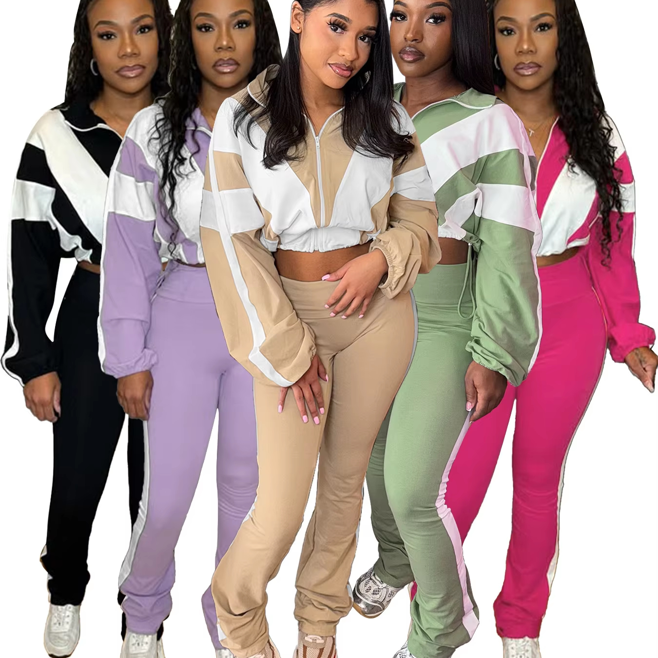 Hr25029 2025 महिलाओं के तीन-टुकड़े सेट लंबे आस्तीन वाले चेस्टस्वैप रंग ब्लॉक करने वाली स्टी कस्टम ट्रैकसूट फिटनेस महिलाओं के सेट